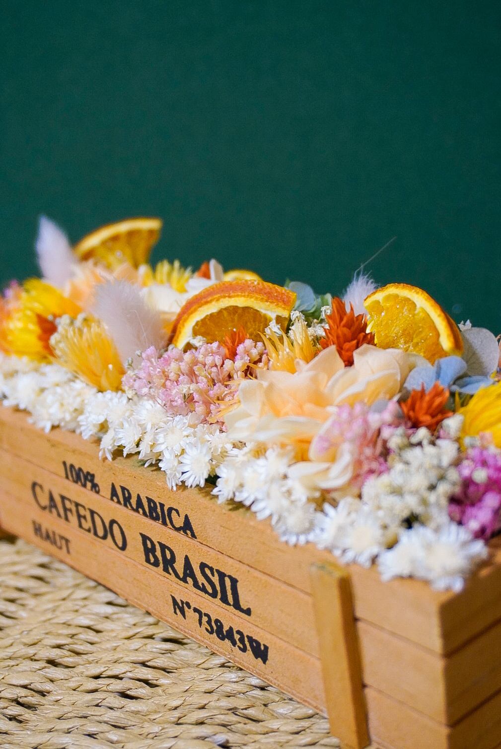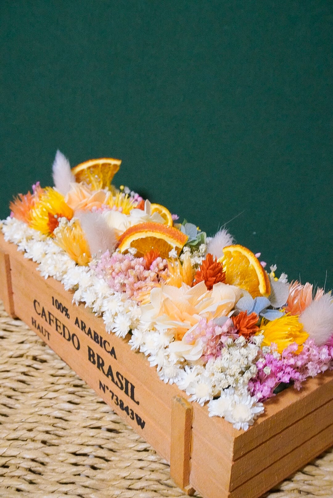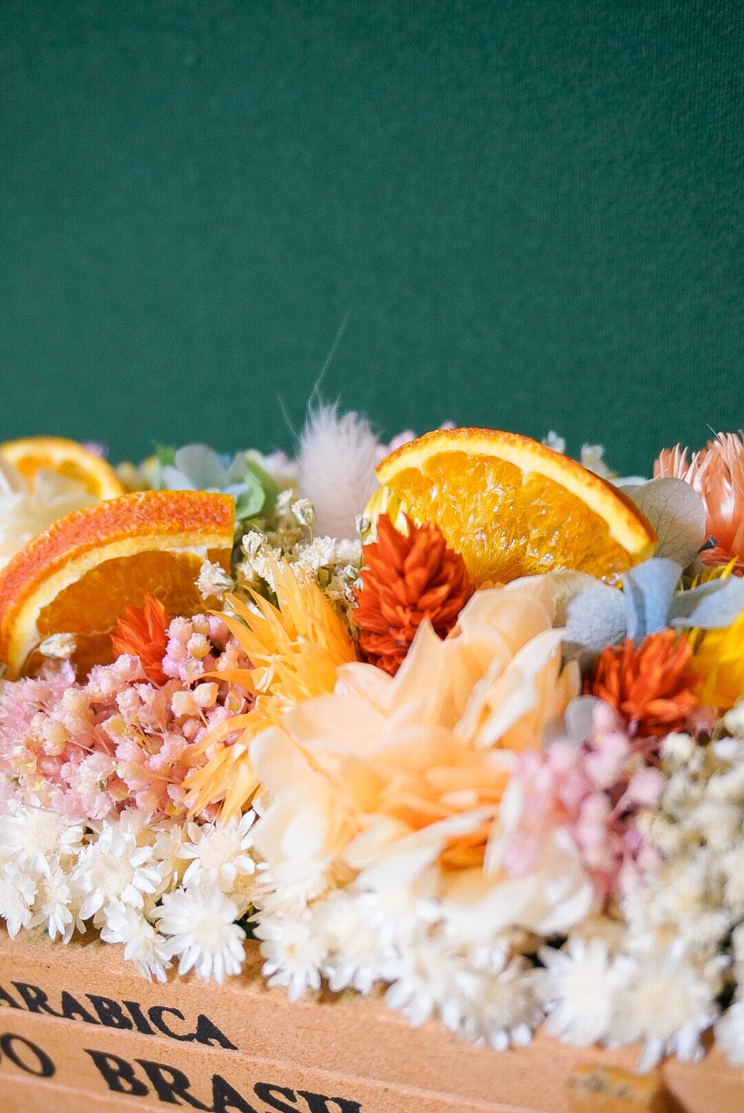 ナチュラルなウッドボックスに、ドライオレンジと色とりどりのドライフラワーをぎゅっと詰め込んだ、明るく元気なアレンジです♪