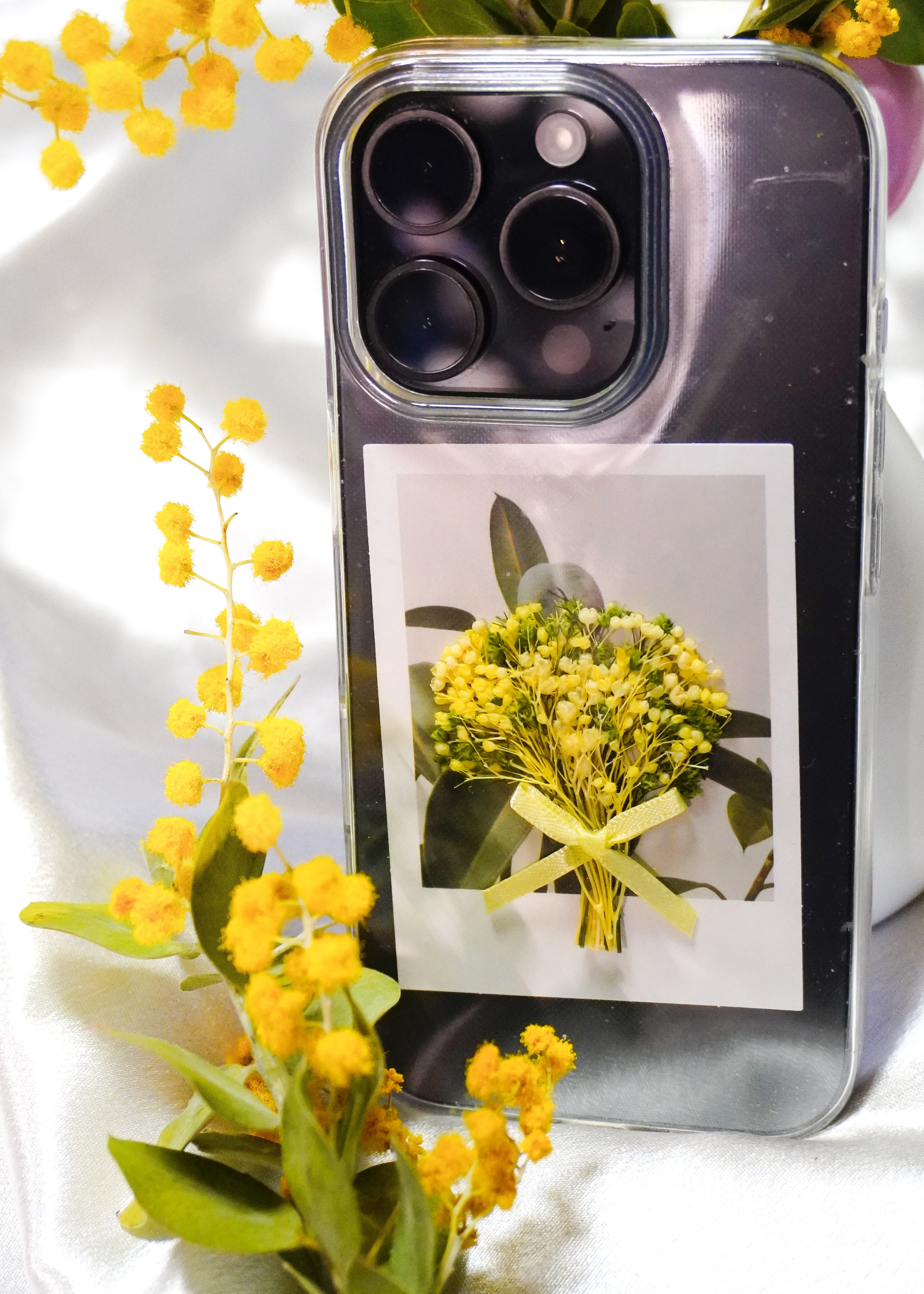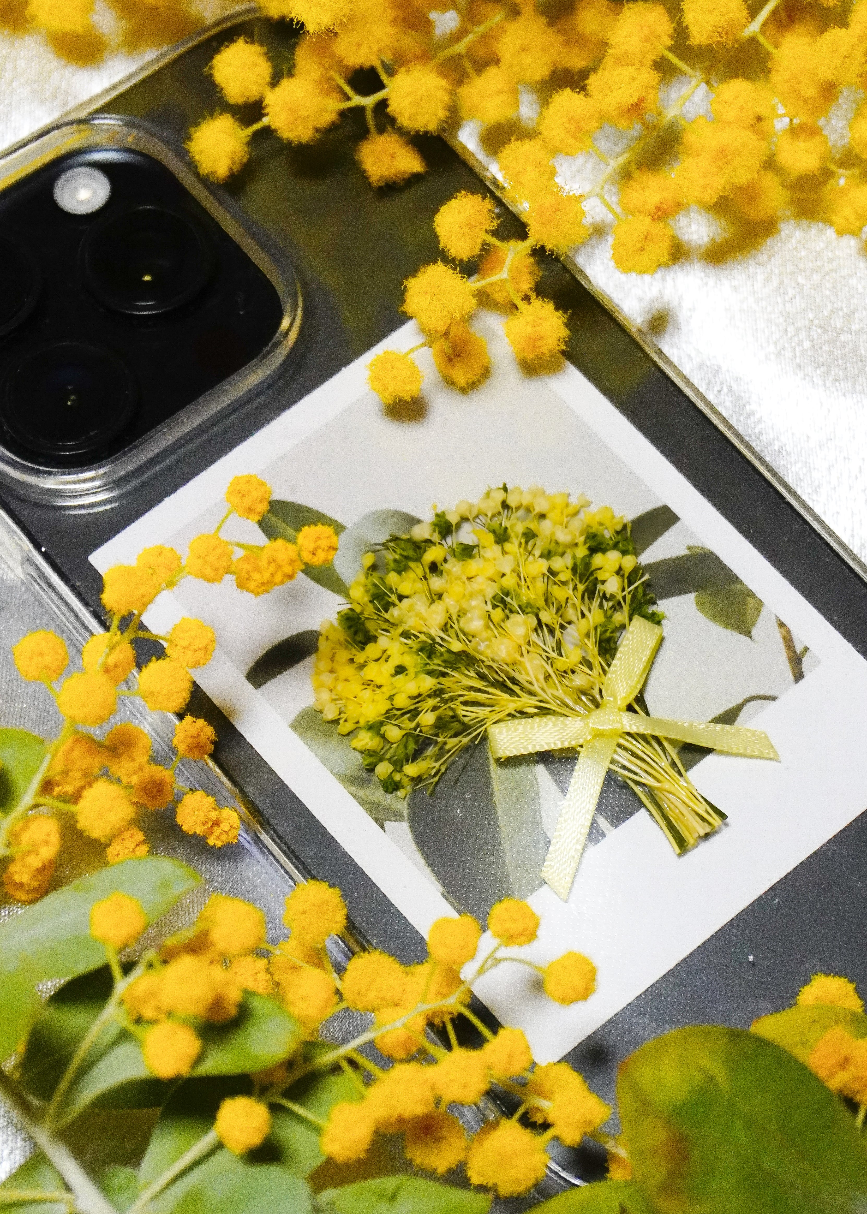 ミモザを思わせるイエローカラーでお作りした期間限定のスマホ用ミニブーケ。